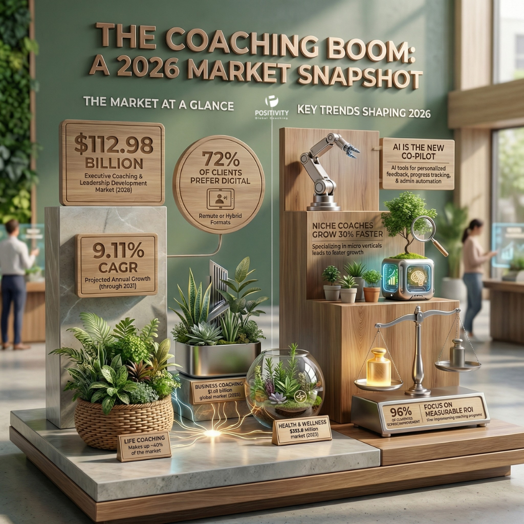 Θέλεις να γίνεις κορυφαίος coach; Η Positivity είναι το όπλο σου. Υποστήριξε ανθρώπους, αναπτύξου εσύ και κυρίεψε την αγορά του coaching. Μια αγορά που το 2029 προβλέπεται να έχει το μέγεθος των $147.48 δισ. μόνο για το executive coaching και το leadership development, από $94.80 που υπολογίζεται ότι έκλεισε το 2024.