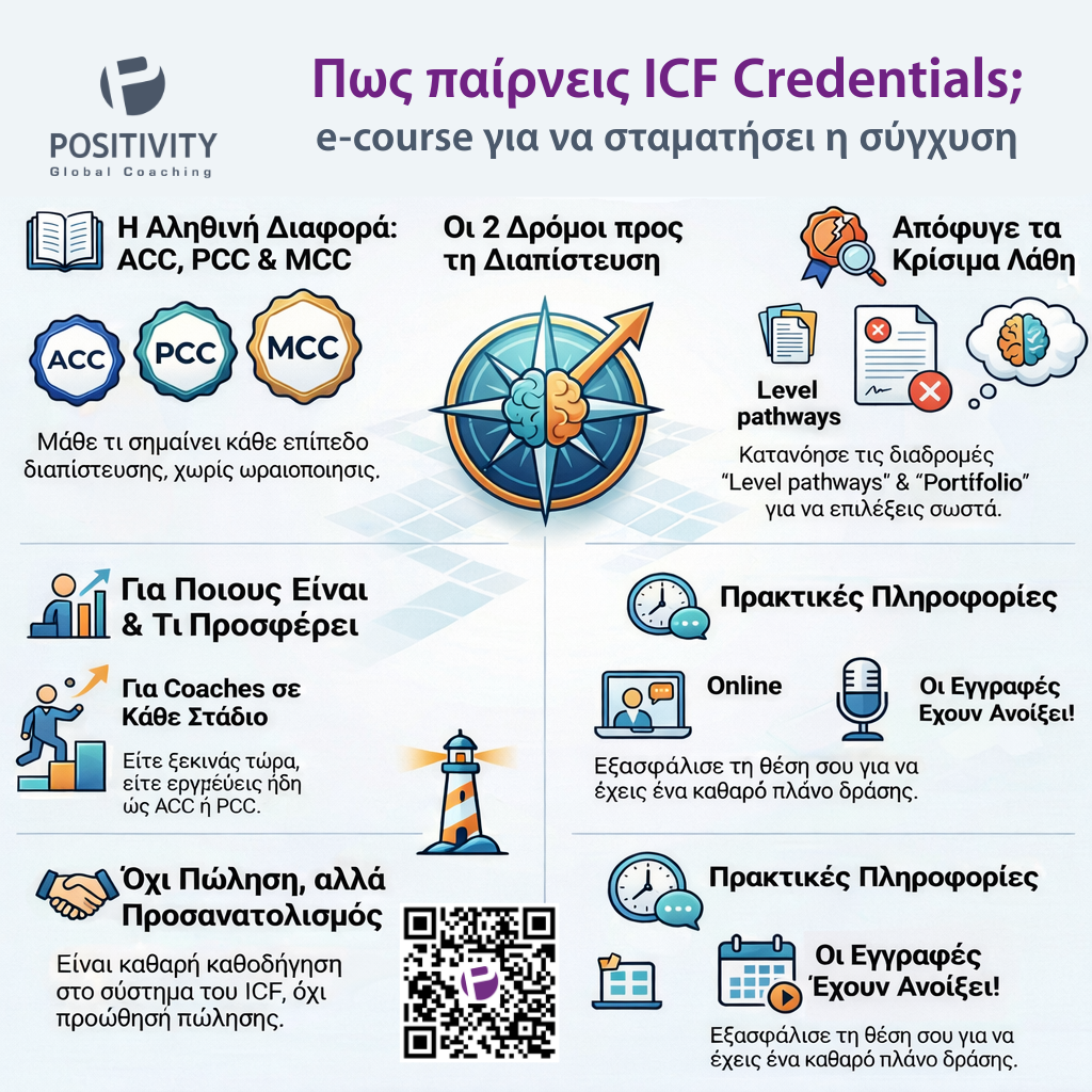 Πιστοποιεί 62 ώρες ICF Level 1 και είναι ιδανικό για το ACC σου.