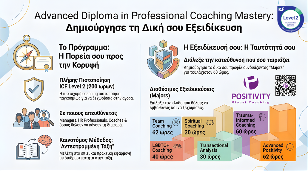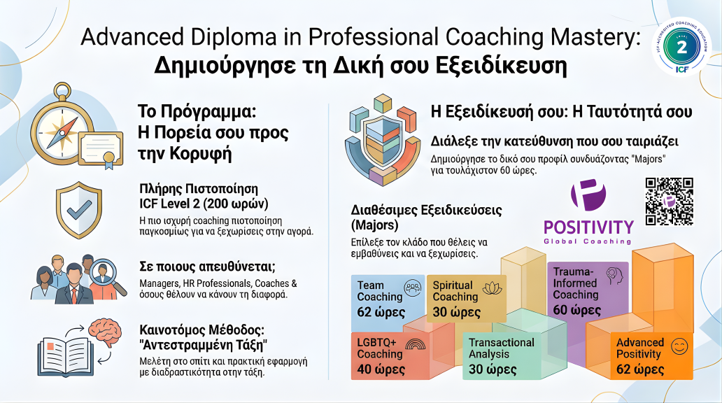 Το Advanced Diploma in Professional Coaching Mastery προσφέρεται από το Positivity Global Coaching, το πρώτο ελληνικό ίδρυμα που απέκτησε την πιστοποίηση ICF Level 2 και Level 3.