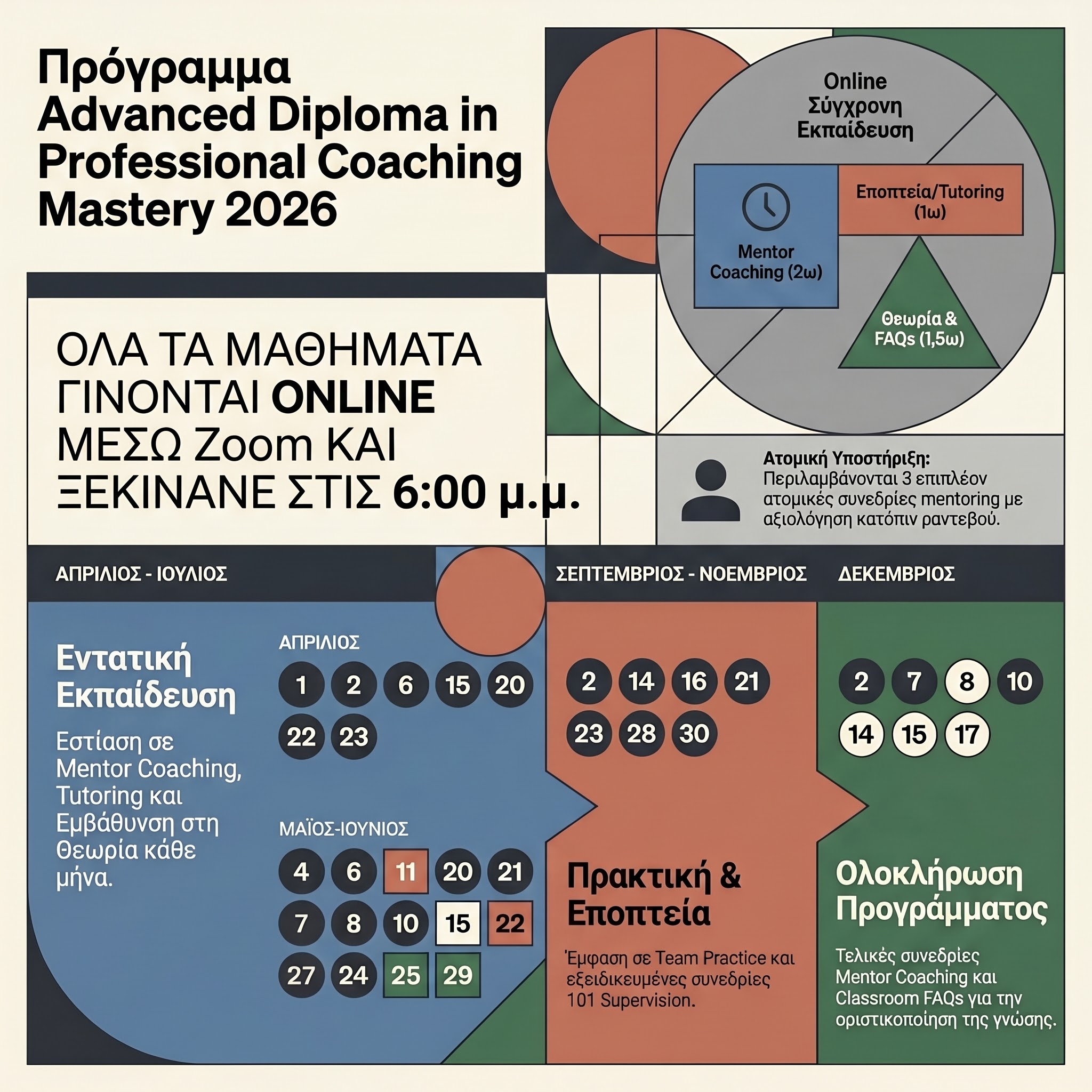 Το Advanced Diploma in Professional Coaching Mastery προσφέρεται από το Positivity Global Coaching, το πρώτο ελληνικό ίδρυμα που απέκτησε την πιστοποίηση ICF Level 2 και Level 3.