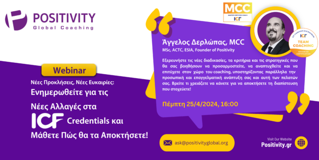 Ονειρεύεστε μια επιτυχημένη καριέρα ως coach; Μη χάσετε το επερχόμενο Webinar της Positivity για τις αλλαγές που αφορούν τα credentials του International Coaching Federation (ICF) για όλα τα επίπεδα (ACC,…